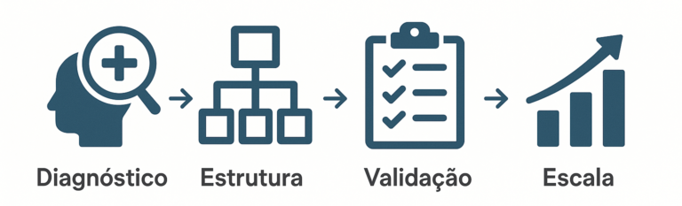 Vamos analisar brevemente sua estrutura atual, identificar gargalos de marketing e apresentar nosso método de diagnóstico, estruturação, validação e escala.